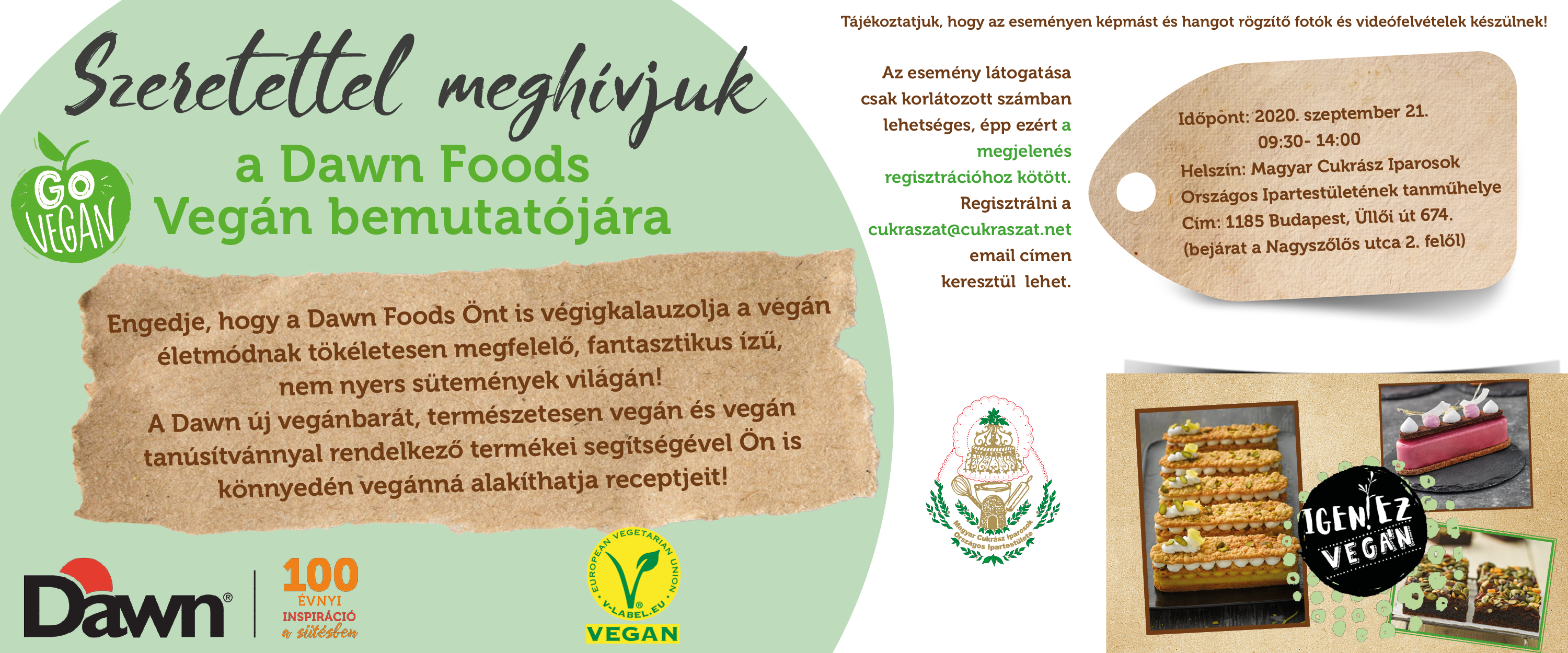 Platina Fokozatú Szponzorunk, a Dawn Foods Hungary Kft. szeretettel meghívja Önöket vegán és vegánbarát sütemények bemutatójára.